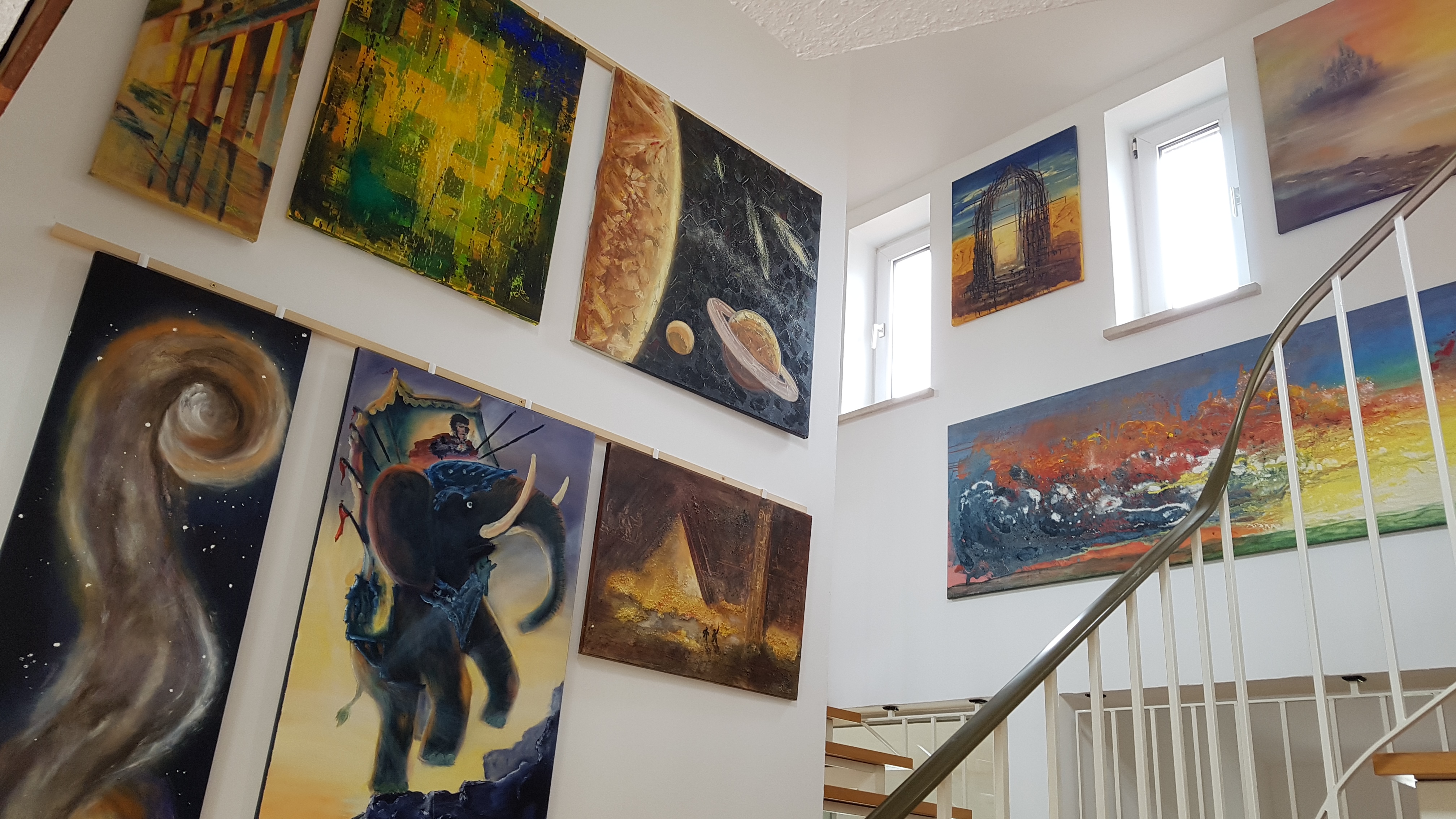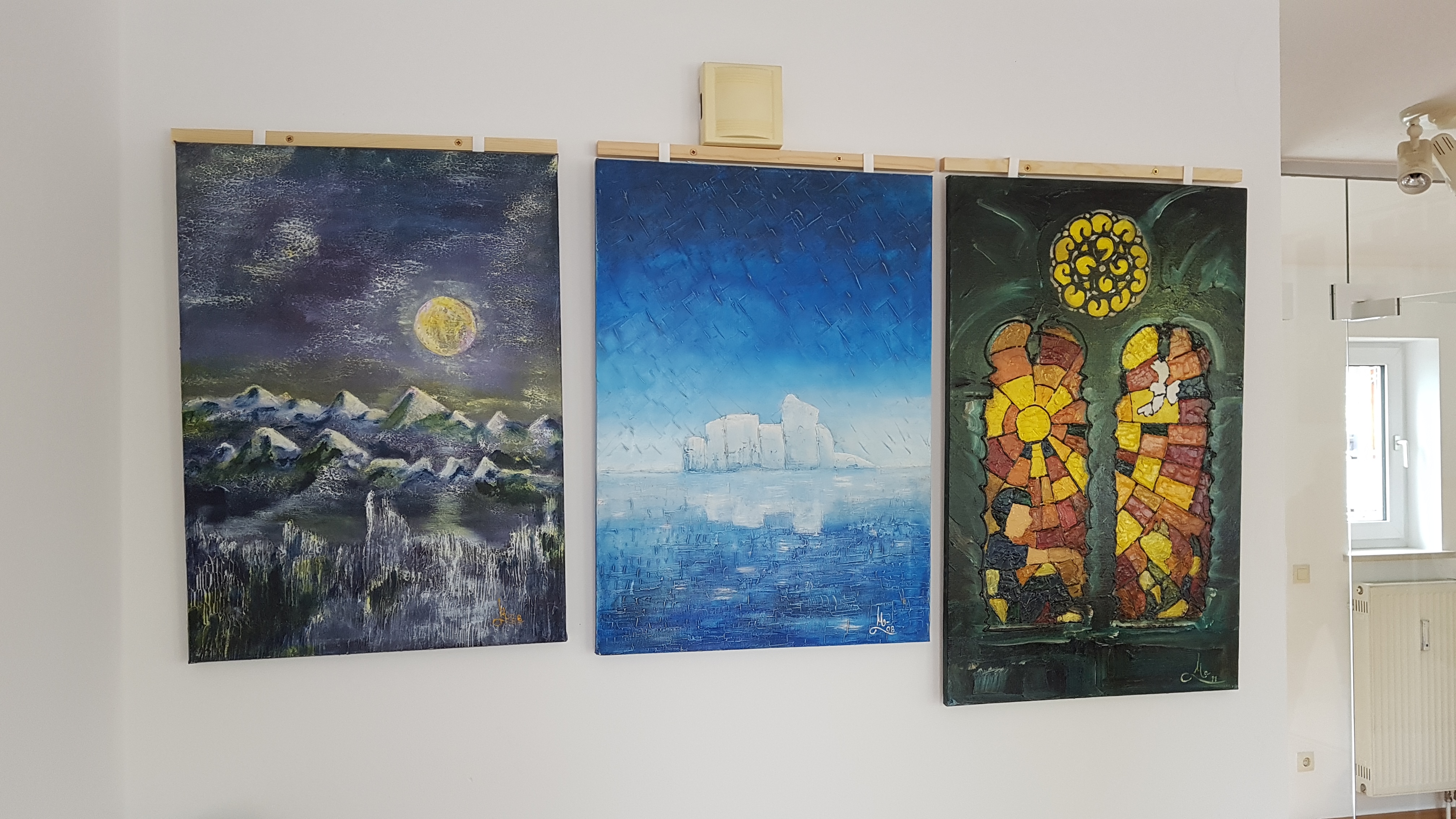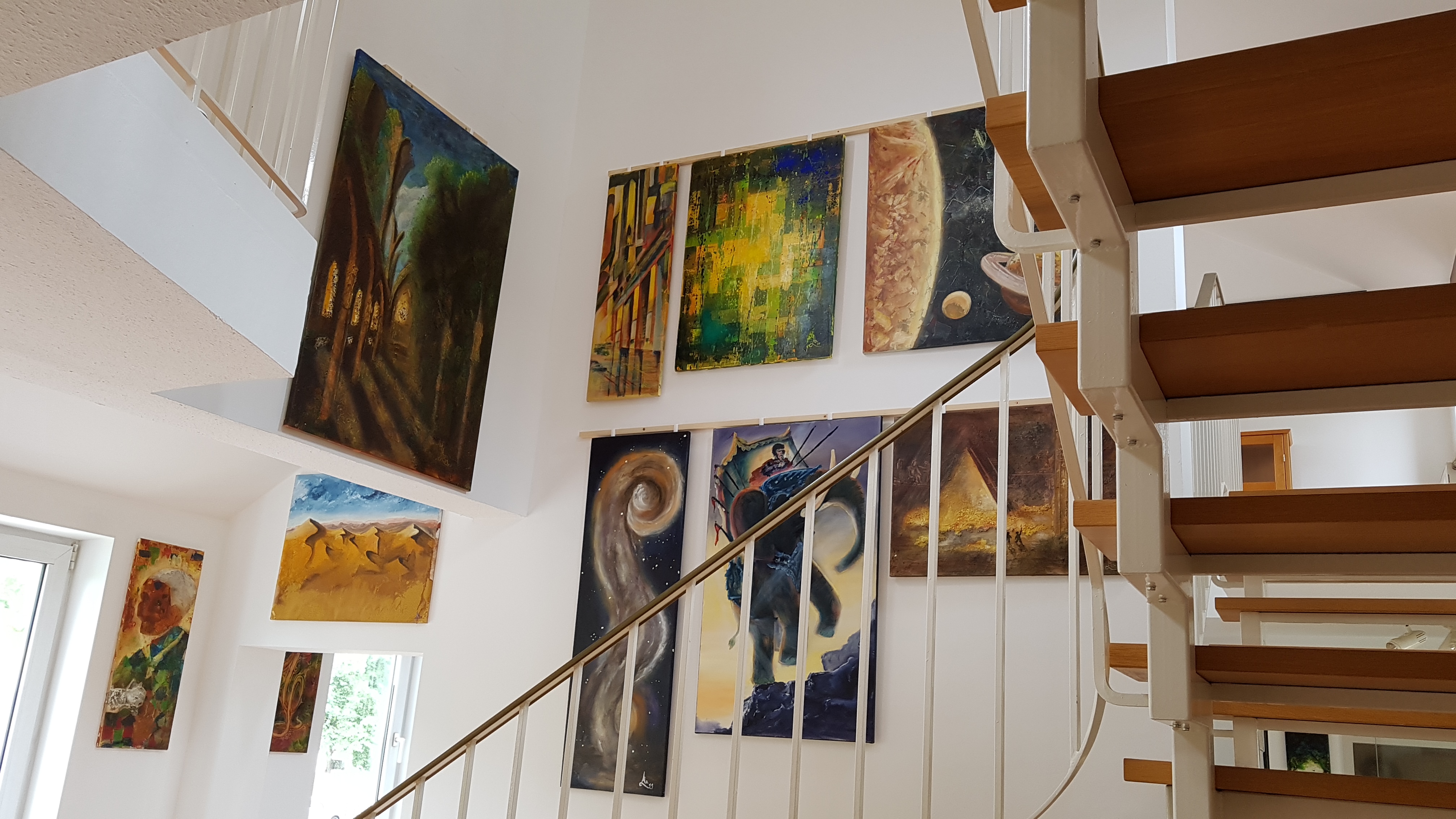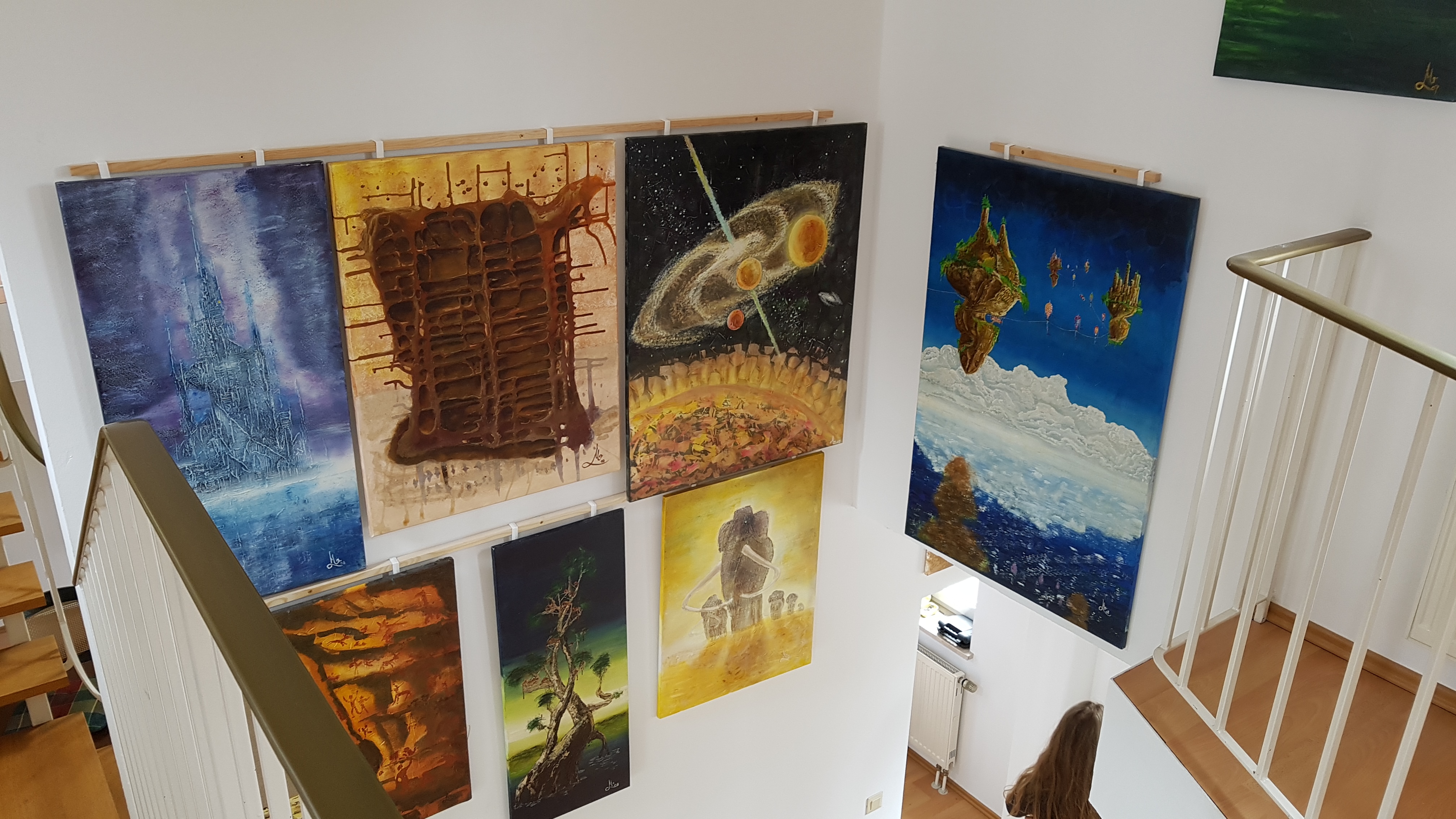 Die Bilder sind Exemplare aus der Malschule FFB, die als Projektbeispiele und Muster für die Schüler (und zum Teil zusammen mit den Schülern) erstellt wurden, um die vielen Techniken aufzuzeigen. Sie sind allesamt auf Leinwand mit Rahmen, mit Acrylfarben und lackiert.