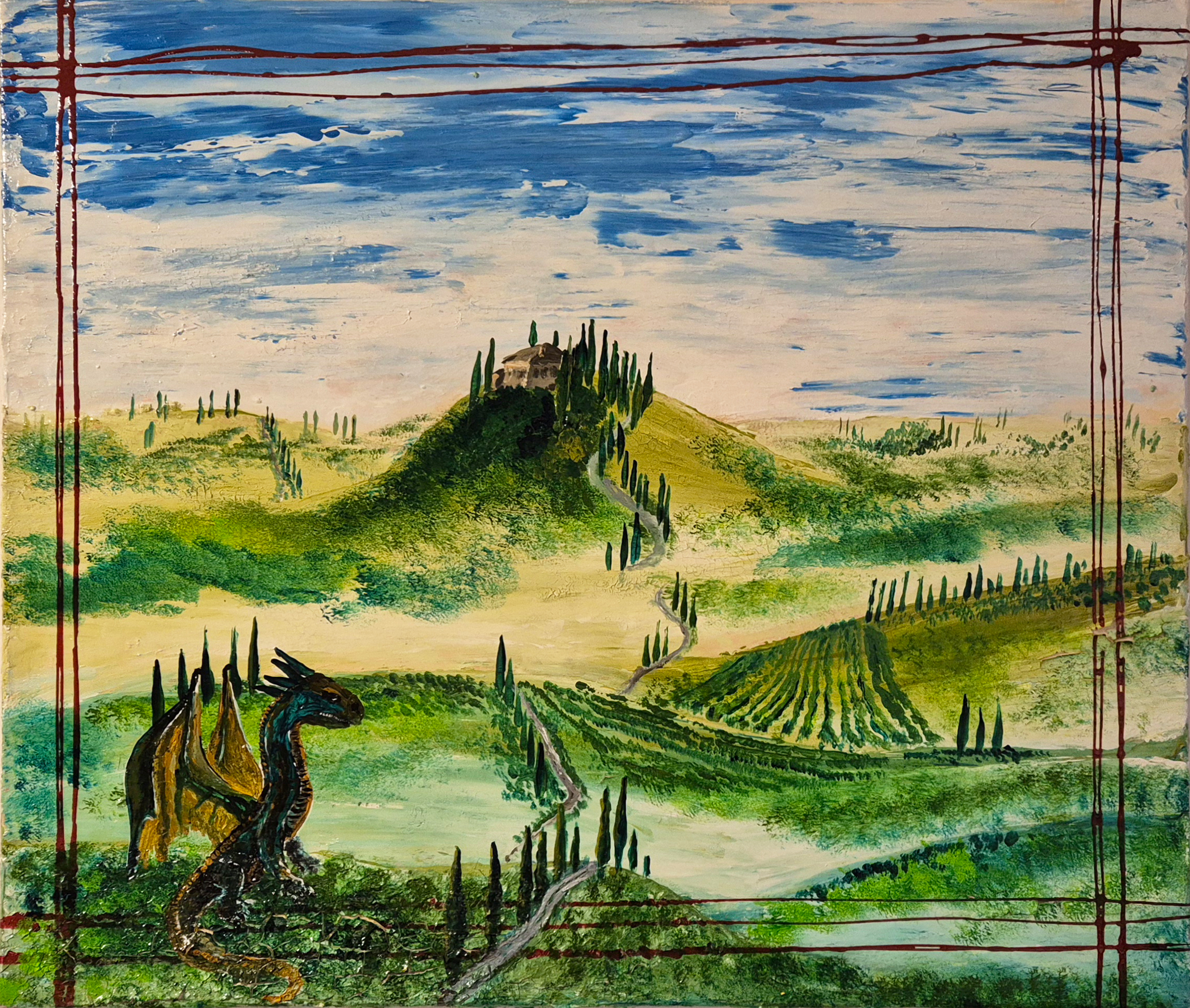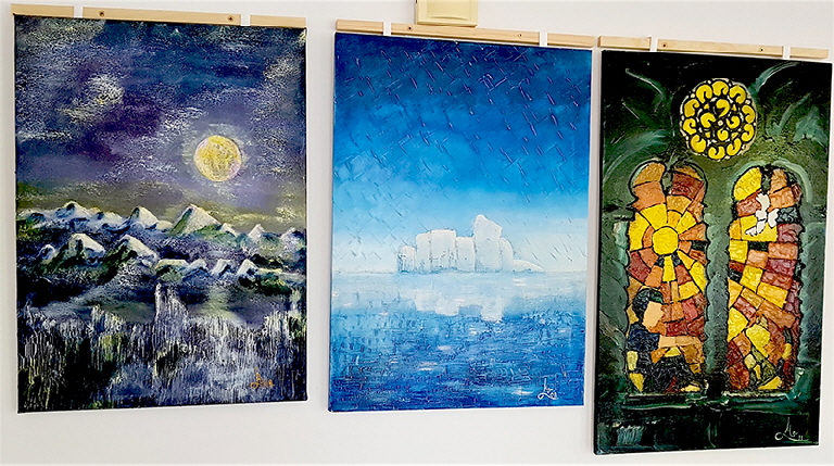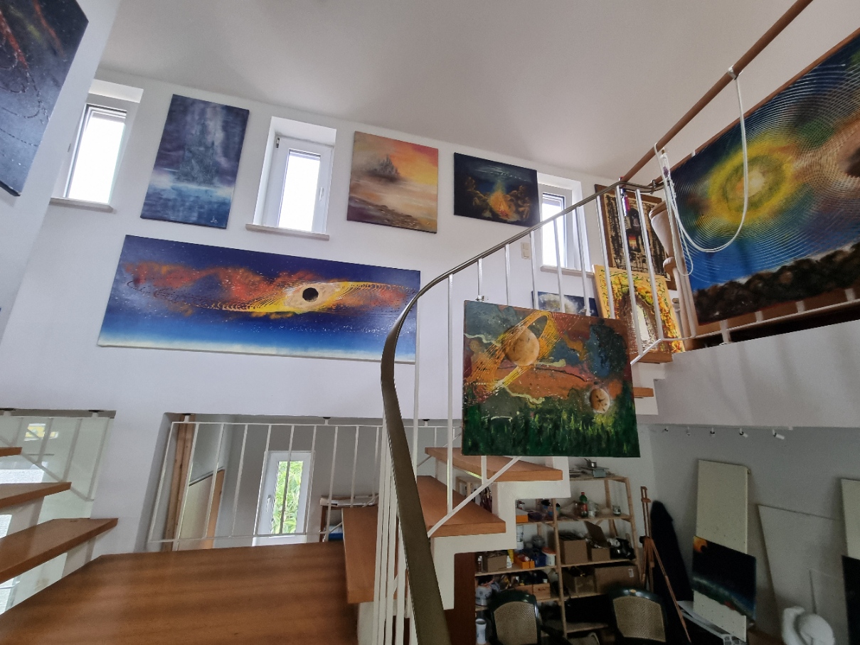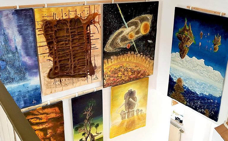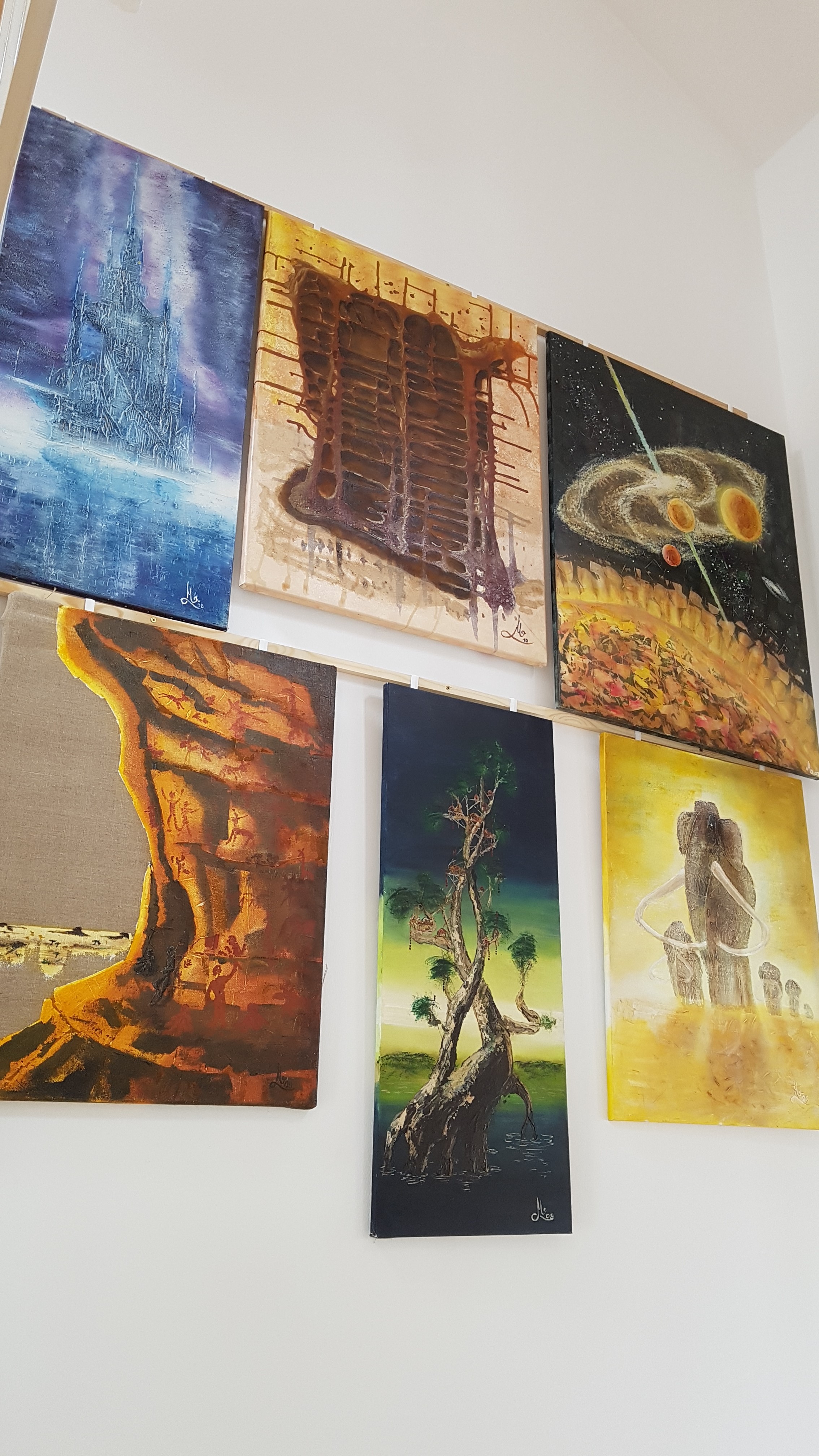 Die Bilder sind Exemplare aus der Malschule FFB, die als Projektbeispiele und Muster für die Schüler (und zum Teil zusammen mit den Schülern) erstellt wurden, um die vielen Techniken aufzuzeigen. Sie sind allesamt auf Leinwand mit Rahmen, mit Acrylfarben und lackiert.