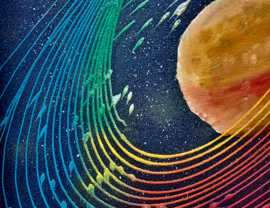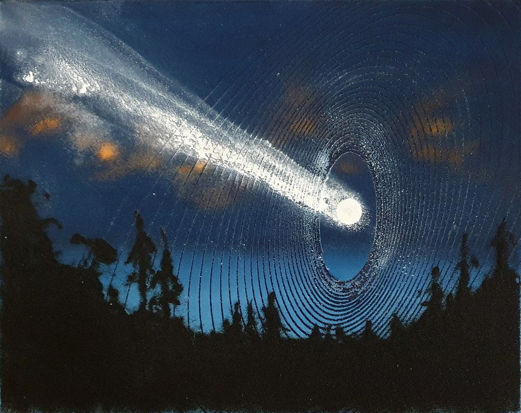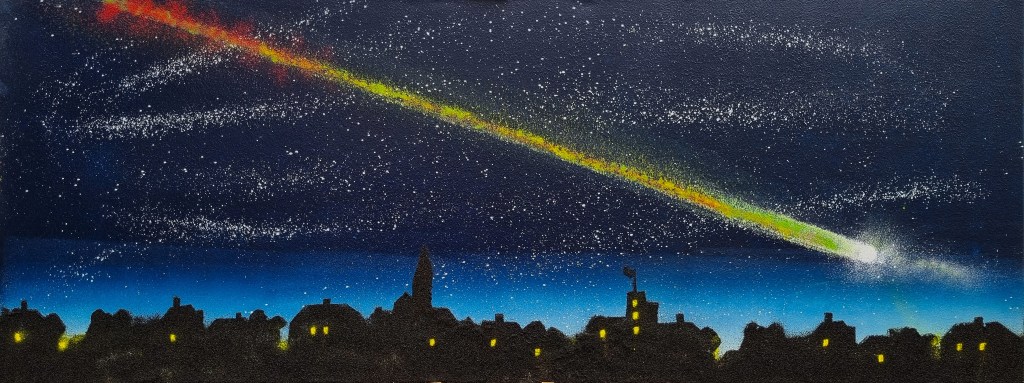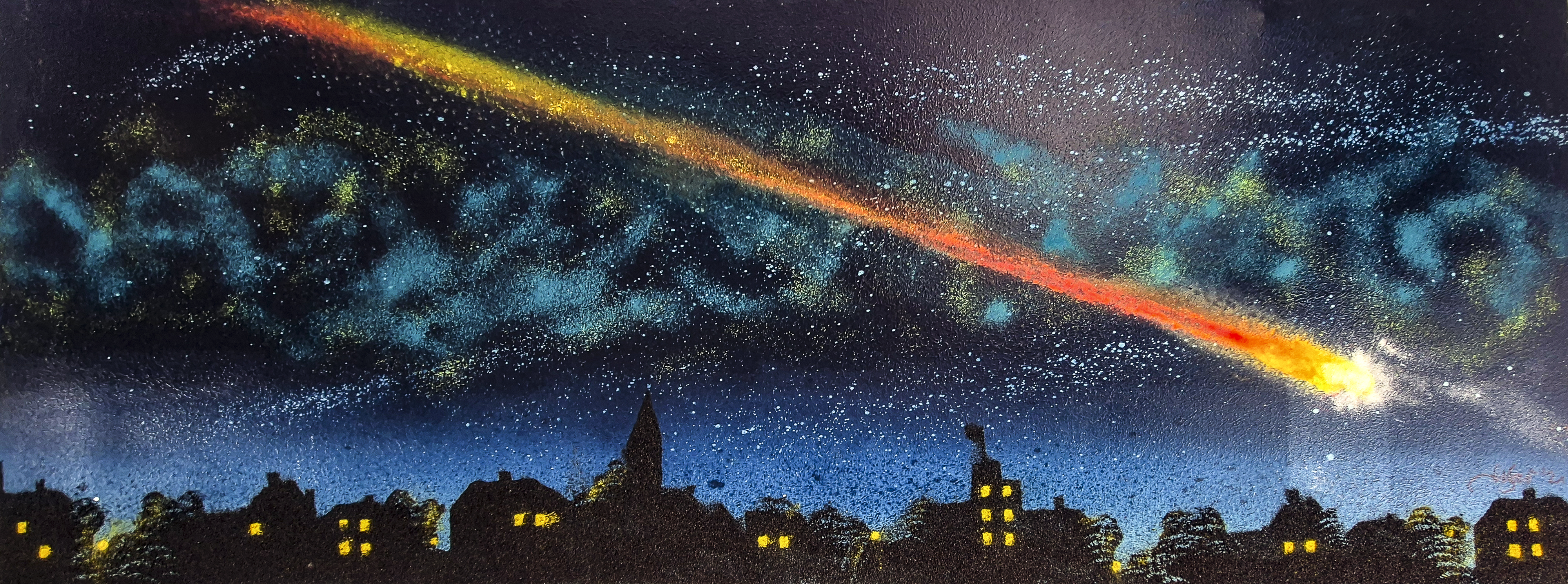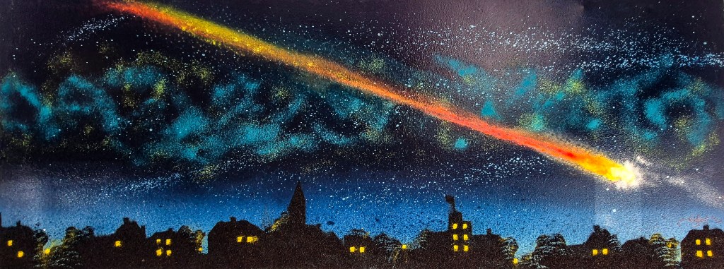 Die „Bing“ -Technik ist eine beliebte Technik in der Malschule. Hier werden Kometen und Strahlen in Regenbogenfarben ausgestrahlt