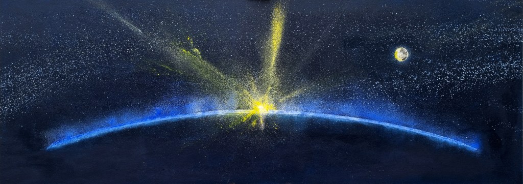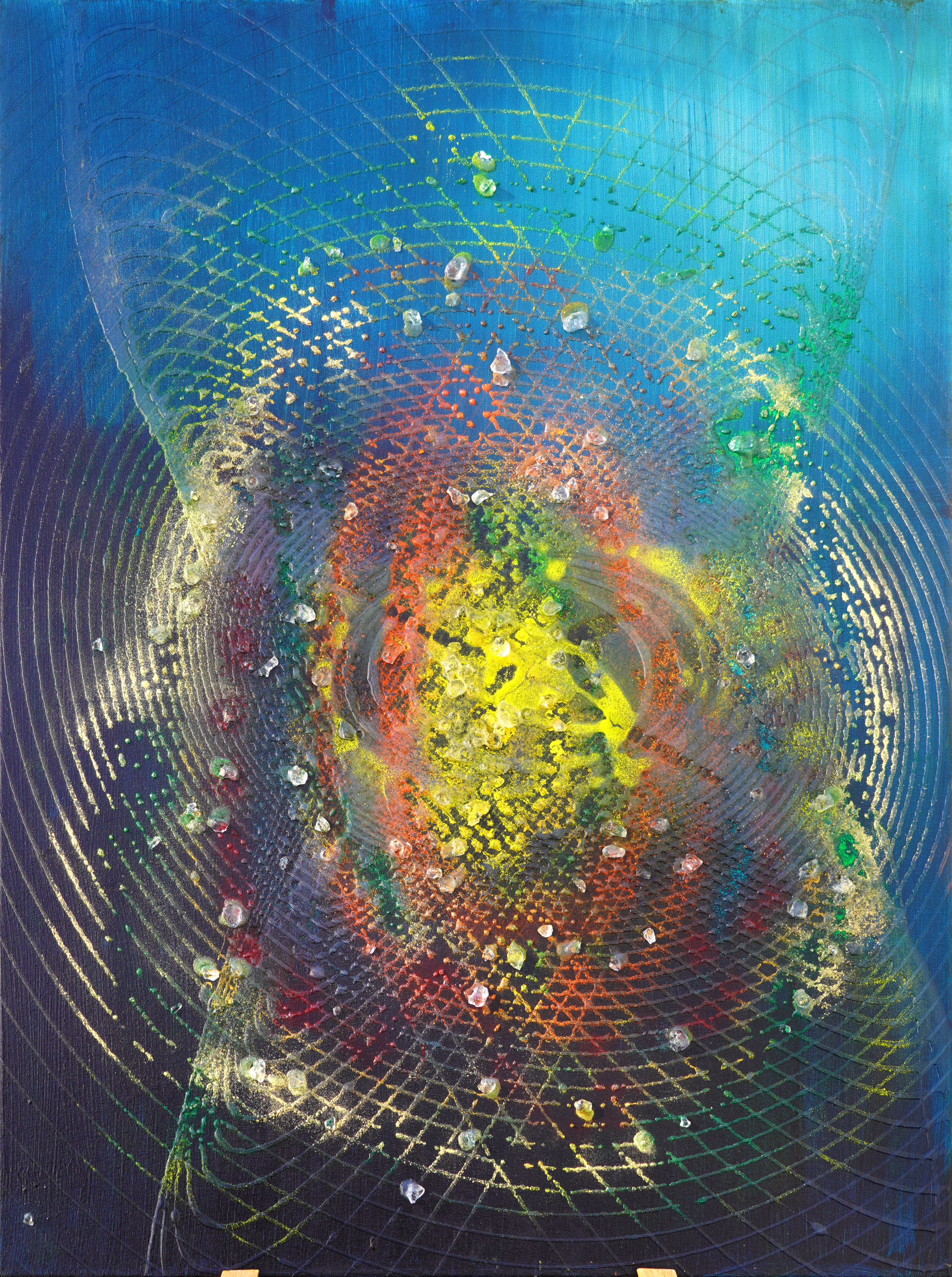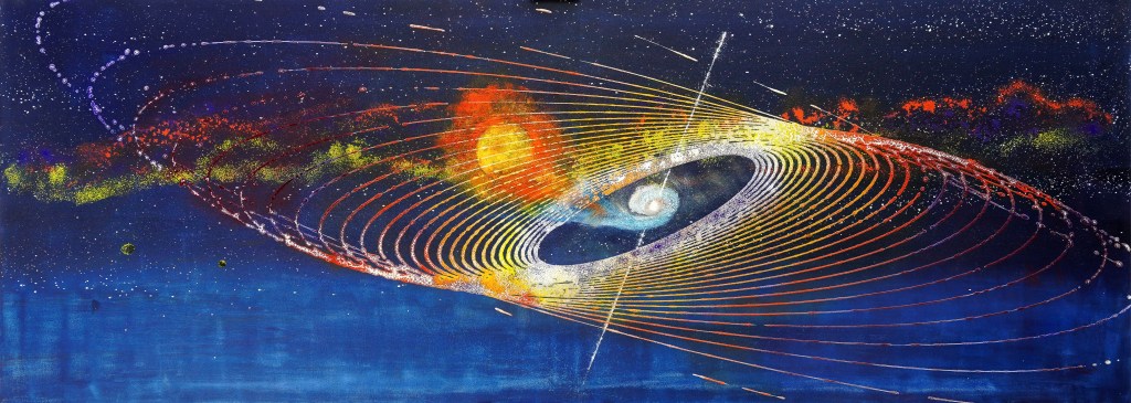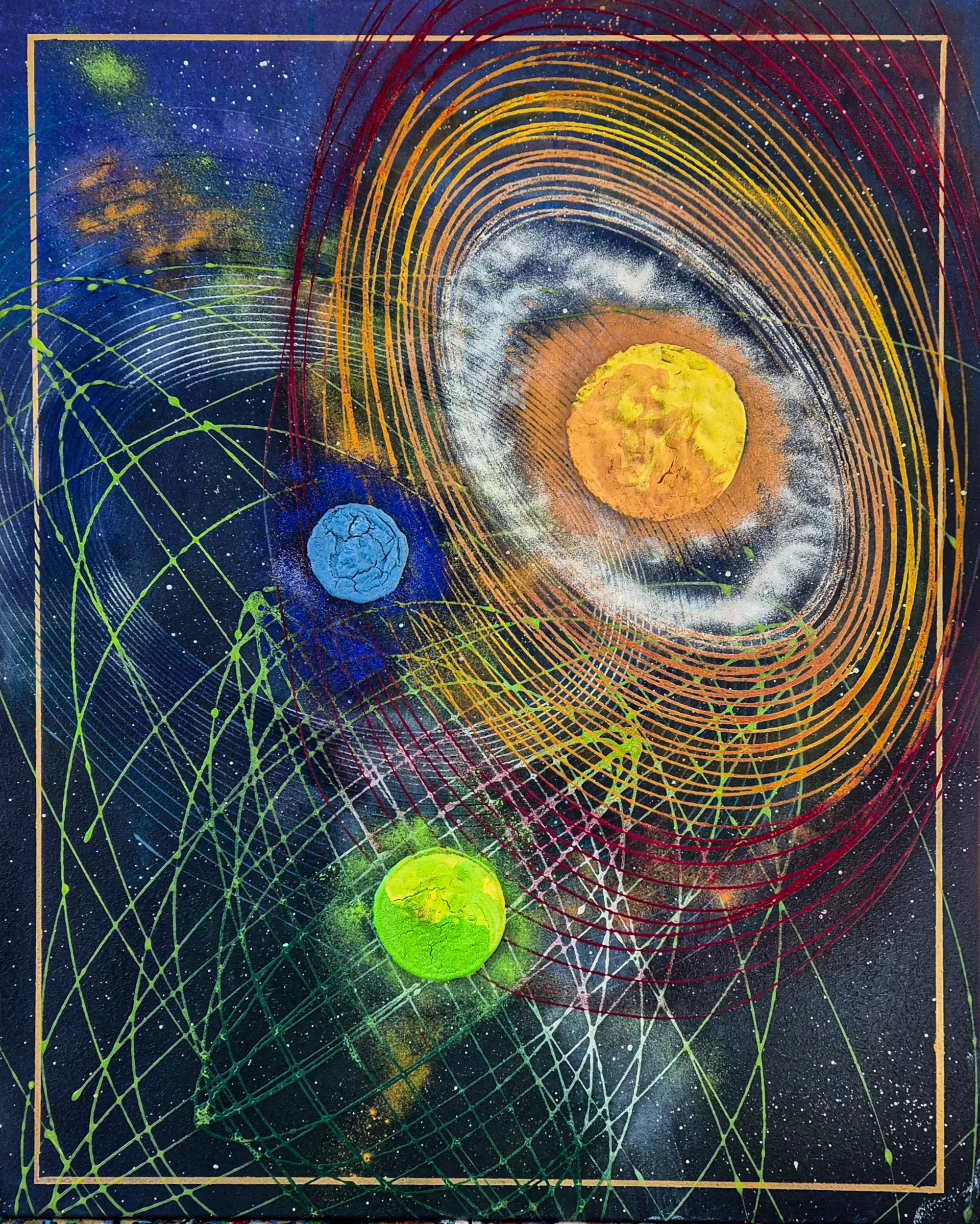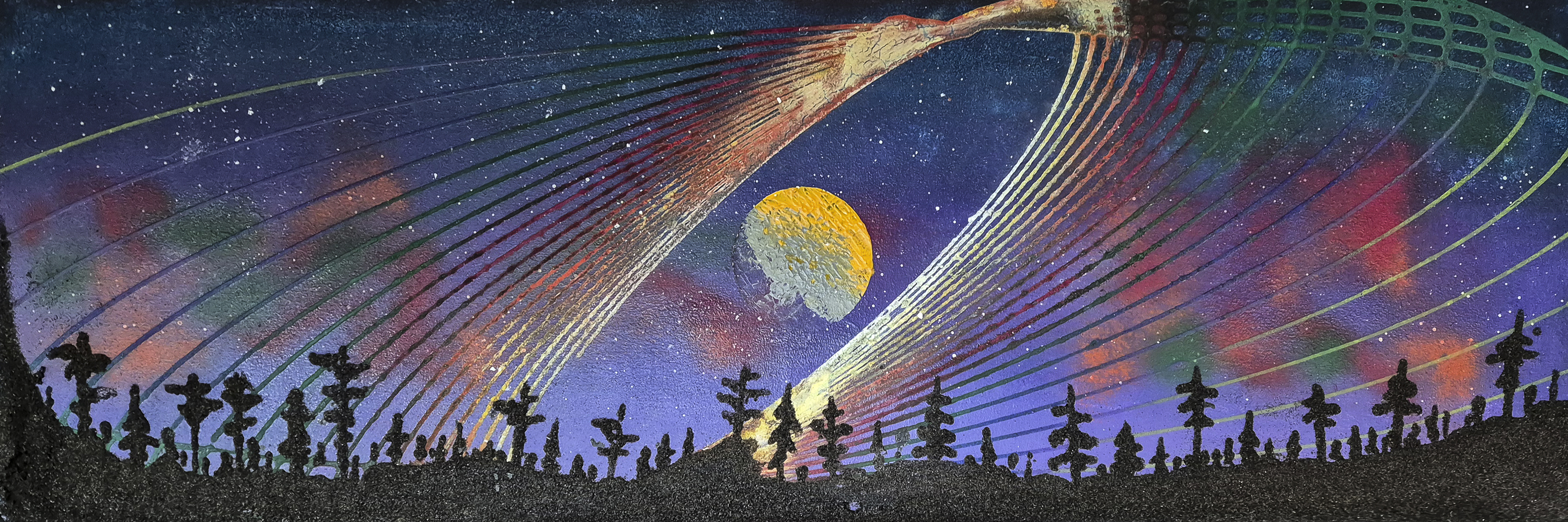 Die „Bing“ -Technik ist eine beliebte Technik in der Malschule. Hier werden Kometen und Strahlen in Regenbogenfarben ausgestrahlt